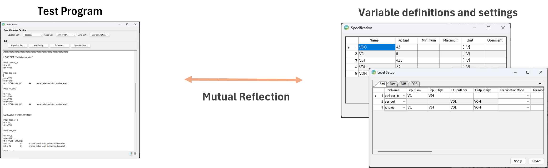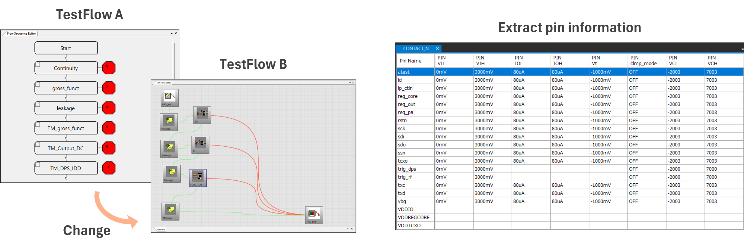 - DUT pin definition - Multi-site configuration - Tester resource (channel) assignment - Pin group settings |