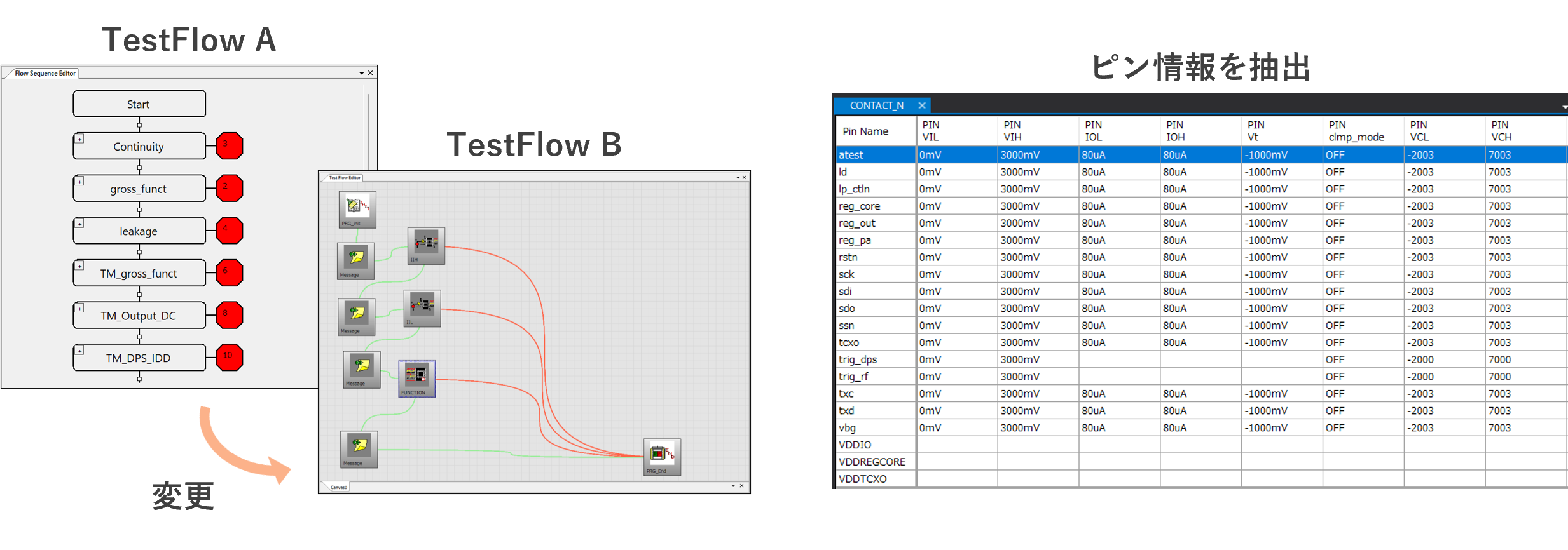 具体的には、TestFlowの編集方法を変更したり、ピン設定の一覧を出力する機能を用意しています。(※1)